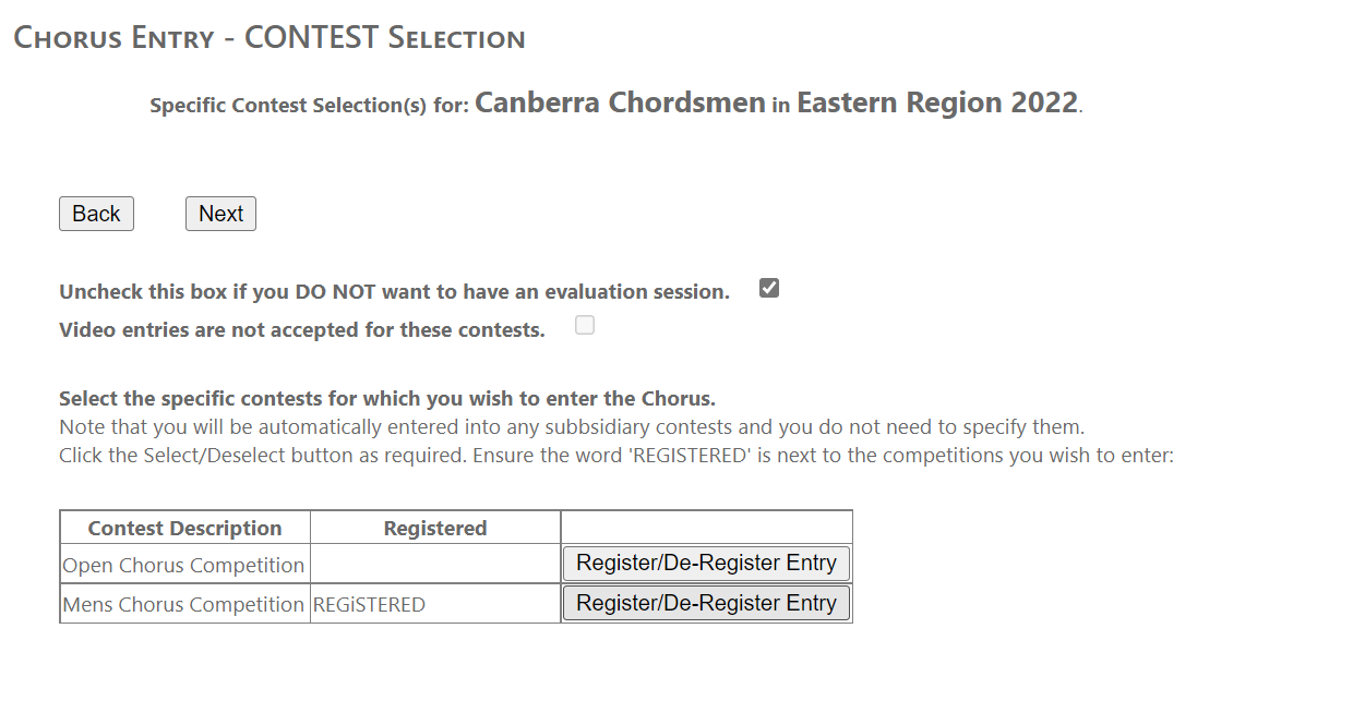 Click on the Register/De-Register Entry buttons to select or deselect the contests required. In this example, the Men's Chorus Competition has been selected, but the Open Chorus Competition has not yet been selected.