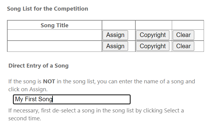 If you have entered a song but then realise you do not have all the details, you can click on the Clear button next to the song that is giving trouble. You must, however, provide a song list no later than 10 days prior to contest. To update or complete a song list after the entry has been submitted, use the Modify or Review Entries menu item.