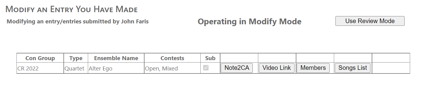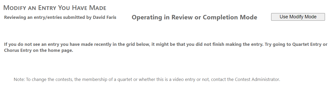 Clicking on "Use Modify Mode" will allow a Songs List, a Chorus List or a by-passed Quartet membership to be completed. For the entry in this example, clicking this button changes the display to the following: