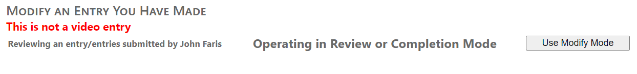 Note that the button on the top right is labelled "Use Modify Mode" and the heading states that the system is currently in "Review or Completion Mode". Completion mode refers to continuing with an entry and submitting it (although in this case the entry is complete rather than the very right button saying continue).