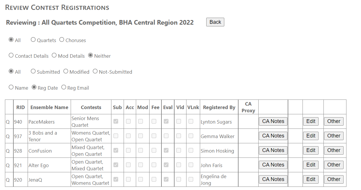 The radio buttons top left control the display in an obvious fashion. Note that the "Choruses" and "Quartets" radio buttons are only of any use if there is an All Ensembles contest and both choruses and quartets are mixed in the one traffic pattern.