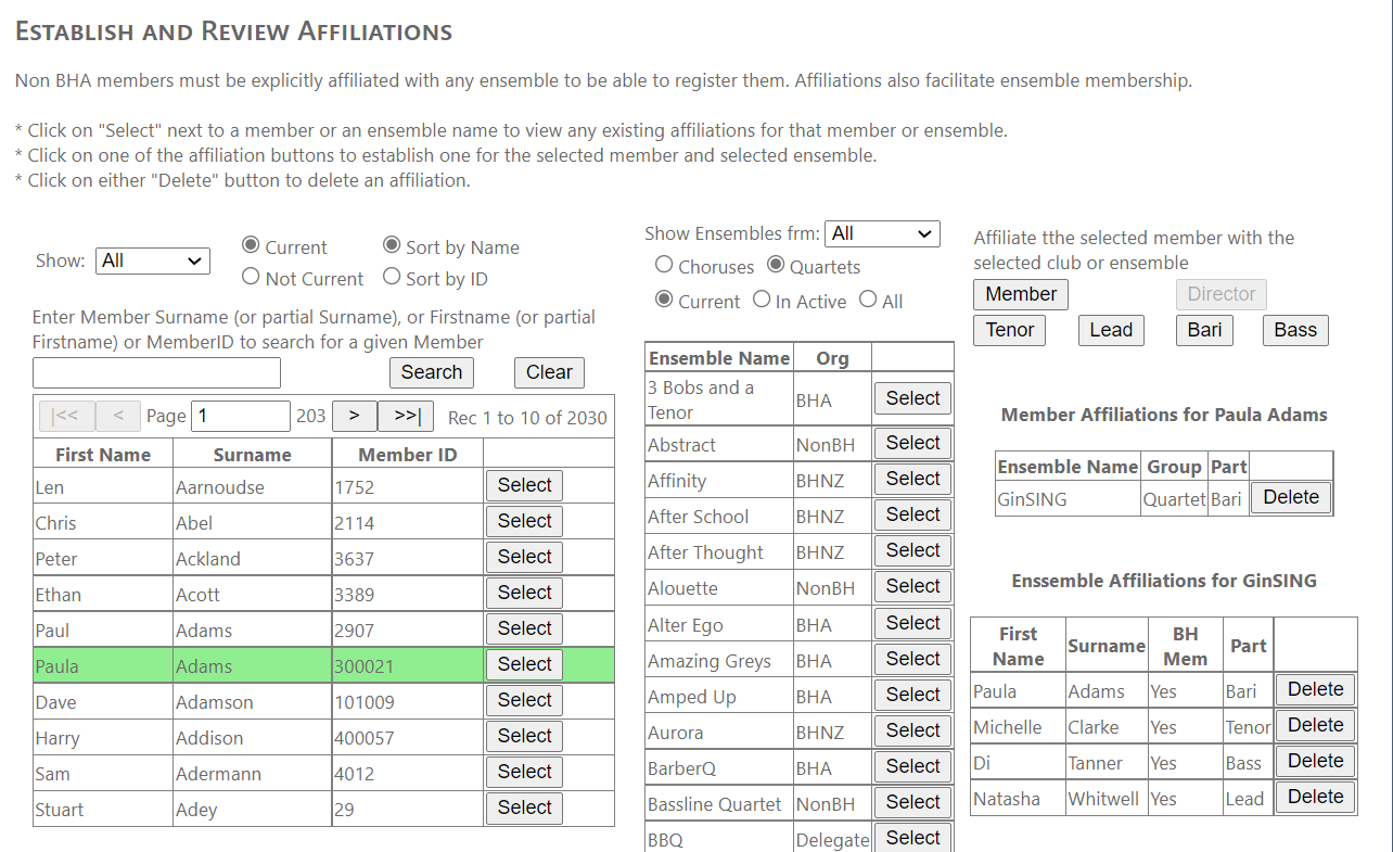 Note that for BHA and BHNZ, only active members will show in any affiliations. BHA and BHNZ members are likely to have an affiliation with a Club as well as with an ensemble (or three).